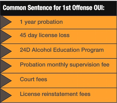 It is important to understand that on a first OUI offense, while jail is possible under the law, it is highly unlikely for a routine case and for someone with no record. A first offense OUI does carry a maximum penalty of 2.5 years in the house of correction. However, the table to the right represents the common sentence for a First Offense OUI.
